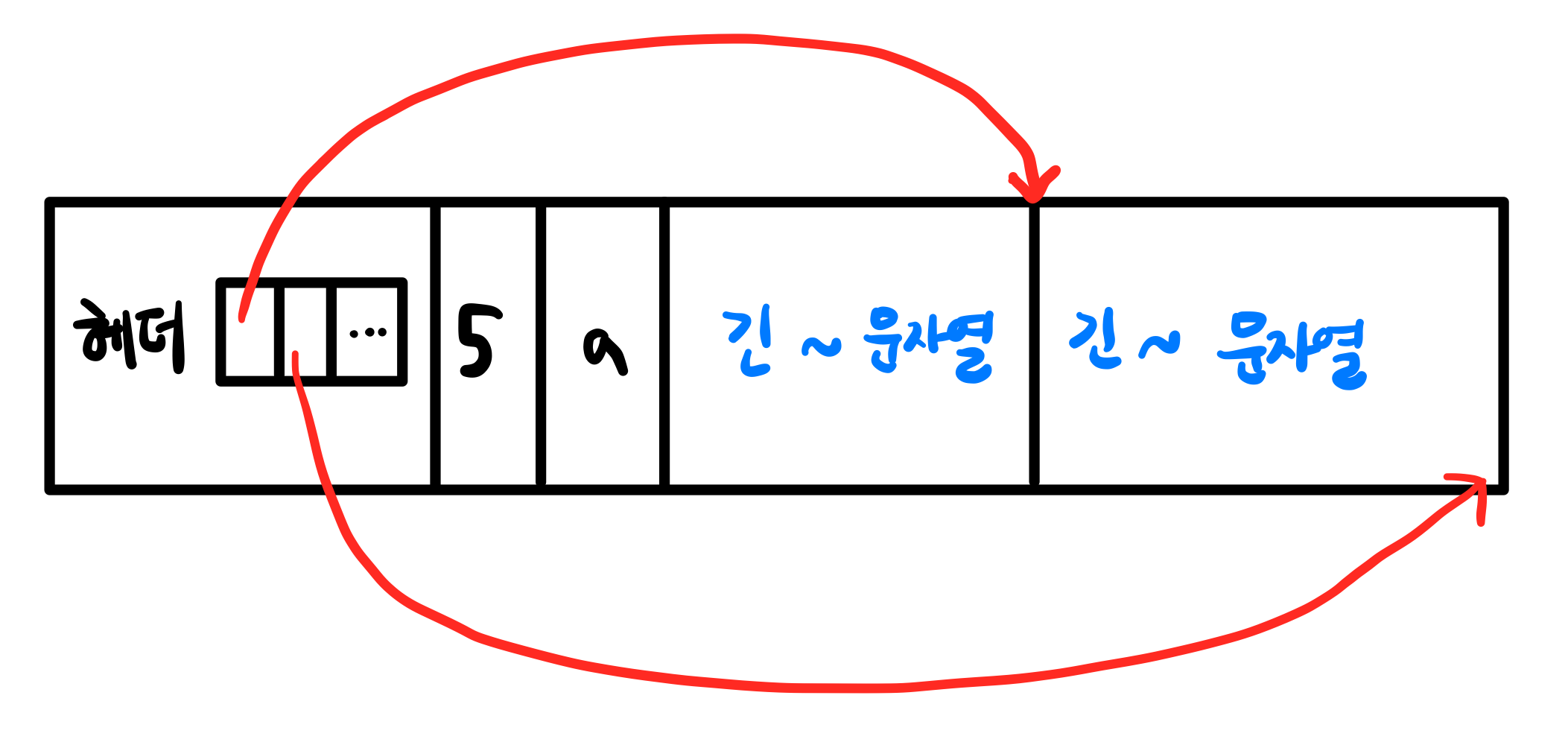 그리고 이를 더 효율적으로 만들면, 위에서 페이지에 헤더를 둔 것처럼 레코드 헤더를 두어 가변길이의 변수의 위치를 관리할 수 있습니다. 이렇게하면 필드 사이즈를 하나하나 따라가서 필드를 찾을 필요 없이, 헤더만을 보고 빠르게 필드의 위치를 찾을 수 있습니다.