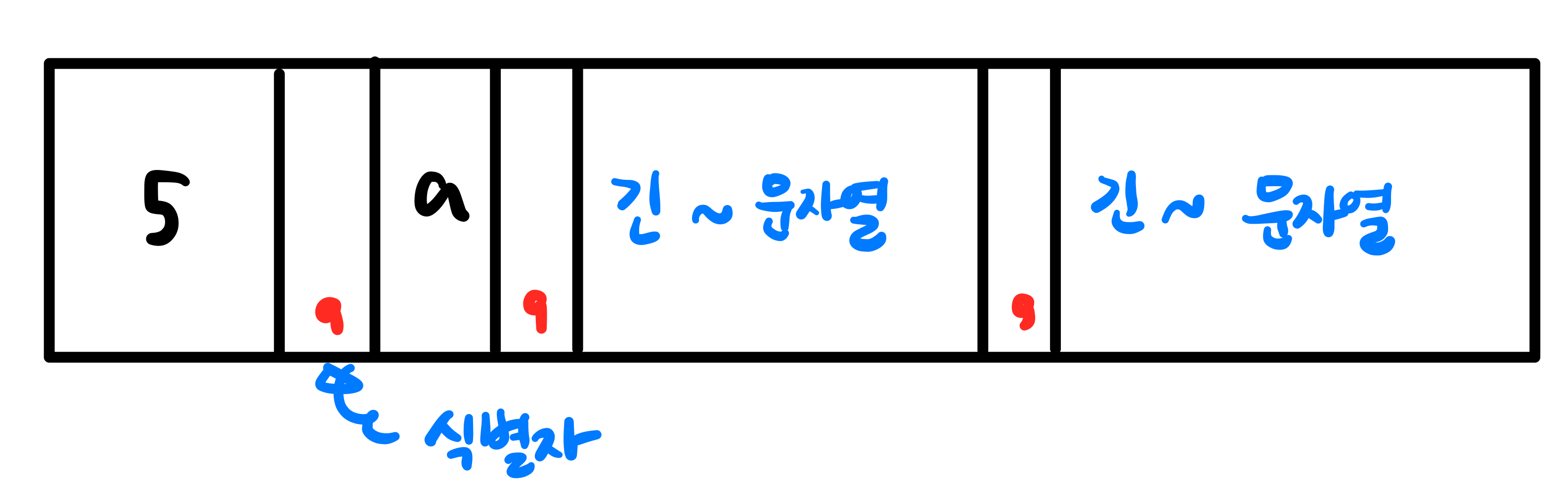3. 각 필드 앞에 필드의 길이를 저장해두는 방법이 있습니다. 이렇게하면 " 필드 내의 값에 식별자가 포함되어있을 경우" 발생하는 문제가 사라집니다. 하지만 여전히 사이즈를 하나하나 살피면서 필드를 찾아가야합니다.