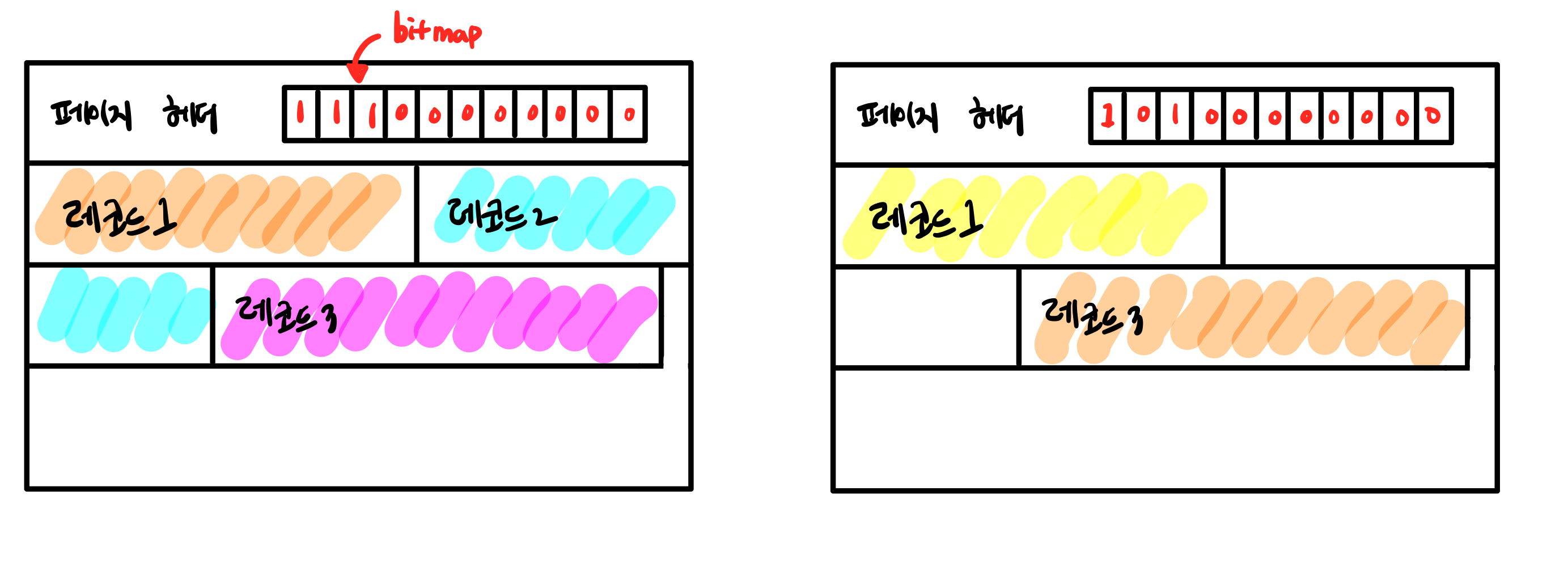 레코드를 패킹하지 않으면 빈 공간이 페이지의 여기저기에 퍼져있기 때문에, 페이지에서 빈 공간을 관리하기 위해 Bitmap에 각 레코드가 비어있는지 아닌지를 표시해두어야합니다.