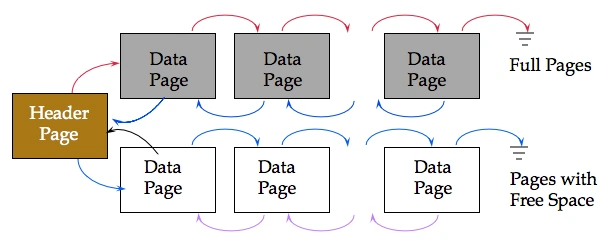 - 페이지들을 링크드리스트로 잇는데, 헤더페이지에서 두 뭉치로 갈라지게 합니다. 한쪽 리스트는 꽉 찬 페이지들을 잇고, 다른 쪽 리스트는 아직 공간이 남아있는 페이지들을 잇습니다.