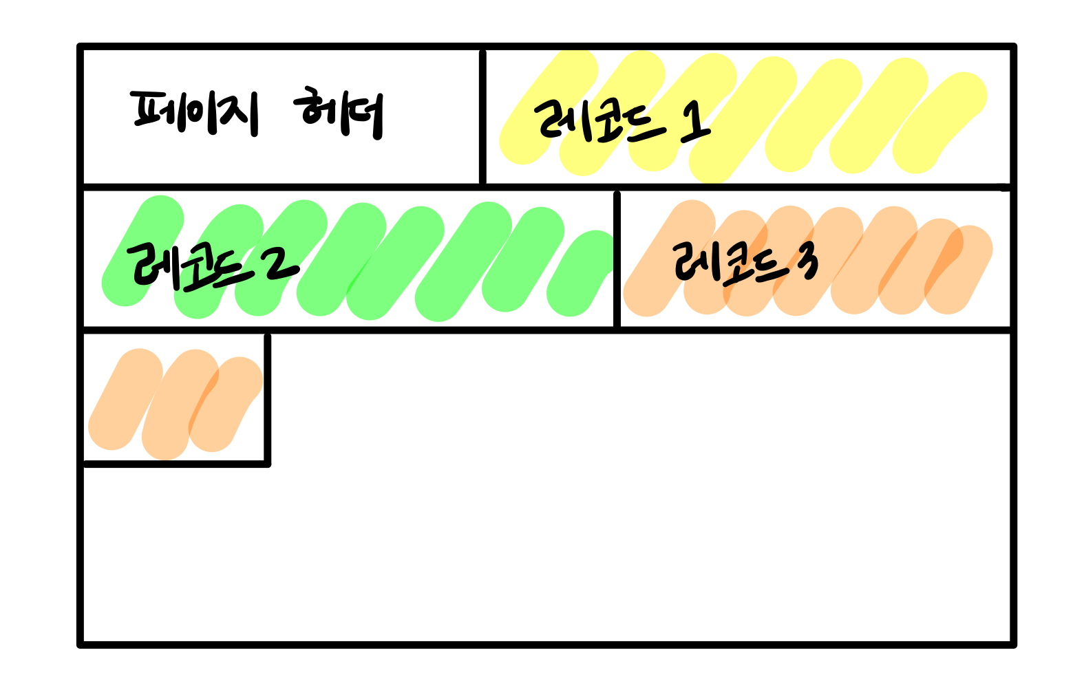 - 여기서 문제점은 특정 레코드를 넣을 수 있을만큼의 남는 공간이 있는 페이지를 찾기 위해 여러 개의 페이지를 하나하나씩 뒤져가며 찾아야한다는 점입니다.
