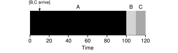 따라서 A가 먼저 들어와 실행되고 10초 후에 B와 C가 들어오게되면, 평균 turnaround time은 (100 + 100 + 110)/3 = 103.33 이 되어 여전히 convoy effect가 발생한다.