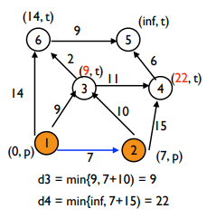 - 아직 최단거리가 구해지지 않은 노드가 존재한다면, 3번에서 선택된 노드를 가지고 연결된 노드들의 d[V]를 업데이트해주고 3번을 반복한다.