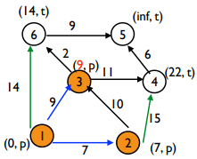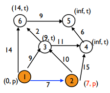 2번 노드가 거리 7로 최소 거리를 가지므로, 2번의 최단거리는 7로 결정됩니다. 따라서 p(permanent) 상태가 됩니다.