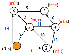 처음에 각 노드의 거리는 최댓값(무한대)으로 초기화해둡니다. t는 temporary로 아직 최단거리가 결정되지 않은 노드를 의미합니다.