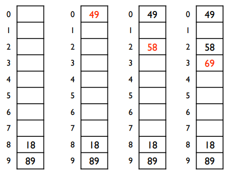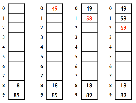 - Linear probing : F(i) = i 인 linear 함수이다. 이 경우 Hash(key)가 실패하면 Hash(key) + 1, Hash(key) + 2...를 차례로 시도한다. 즉 collision이 발생하면 계속해서 바로 다음 칸으로 가 다시 시도하는 것이다.