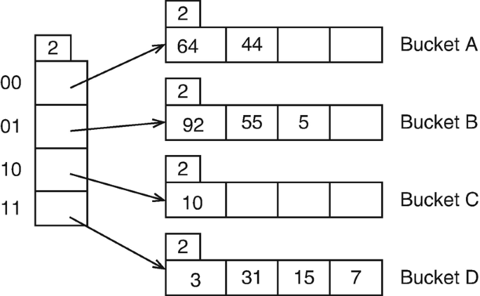 그러면 이제 원하는 값을 찾으려면 어떤 버킷을 살펴봐야할지 결정하기 위해 메인메모리에 Directory라는 자료구조를 저장해둔다. 각 디렉토리는 연관되는 버킷의 디스크 주소를 담고있다.