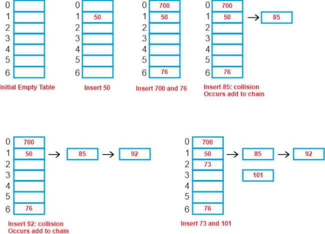 위와 같이 해시함수를 적용했을 때, 해시 테이블의 같은 슬롯으로 맵핑되는 키값들을 리스트로 달아두는 방법이다.
