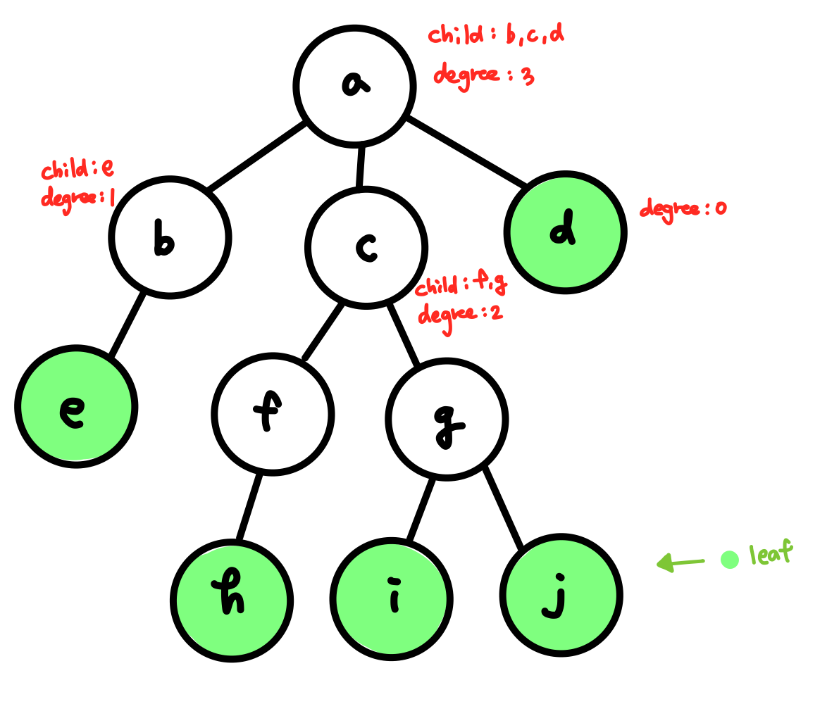 ex) a 노드의 height : 3 (a노드에서 leaf 노드인 d까지는 경로의 길이가 1이고, e까지는 2이지만, h, i, j까지는 3이고, height는 가장 긴 길이를 의미하기 때문에 3이 됩니다.)