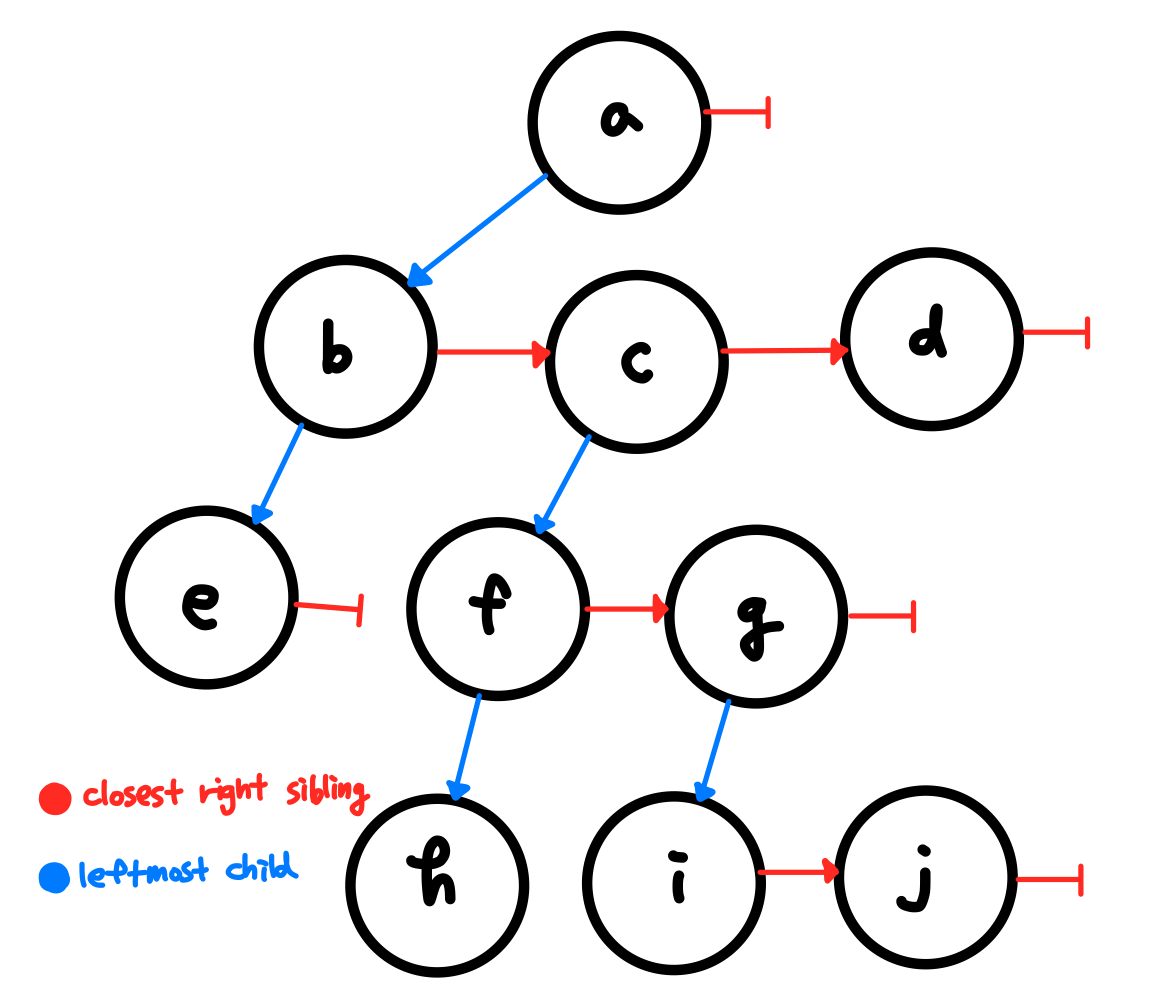 트리의 모든 노드들은 최대 하나의 leftmost child 노드가 있고, 최대 하나의 가장 가까운 오른쪽 sibling 노드를 가지고 있습니다. 이러한 특징을 이용하여 각 노드마다 leftmost child와 closest right sibling 을 가리키는 두개의 포인터만을 저장해두면 트리를 나타낼 수 있게됩니다.