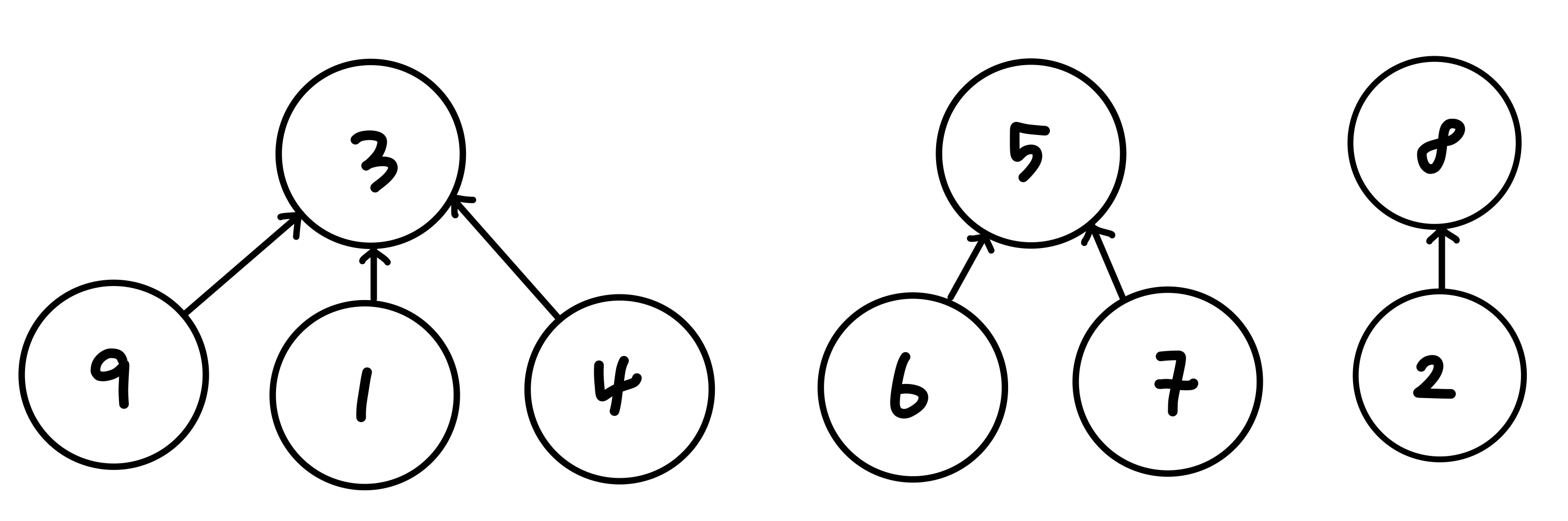 예를 들어, 위의 서로소집합을 다음과 같은 트리로 만들 수 있습니다. 여기서 어떤 노드가 상위에 있는지는 중요하지 않습니다. 같은 트리에 있기만 한다면 모두 같은 서로소집합의 요소가 됩니다.