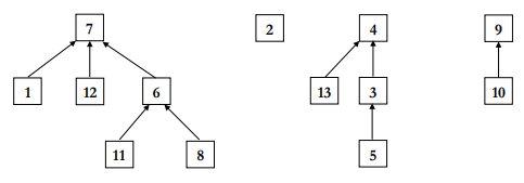 Disjoint set은 거꾸로된 트리들을 통해 구성할 수 있습니다.