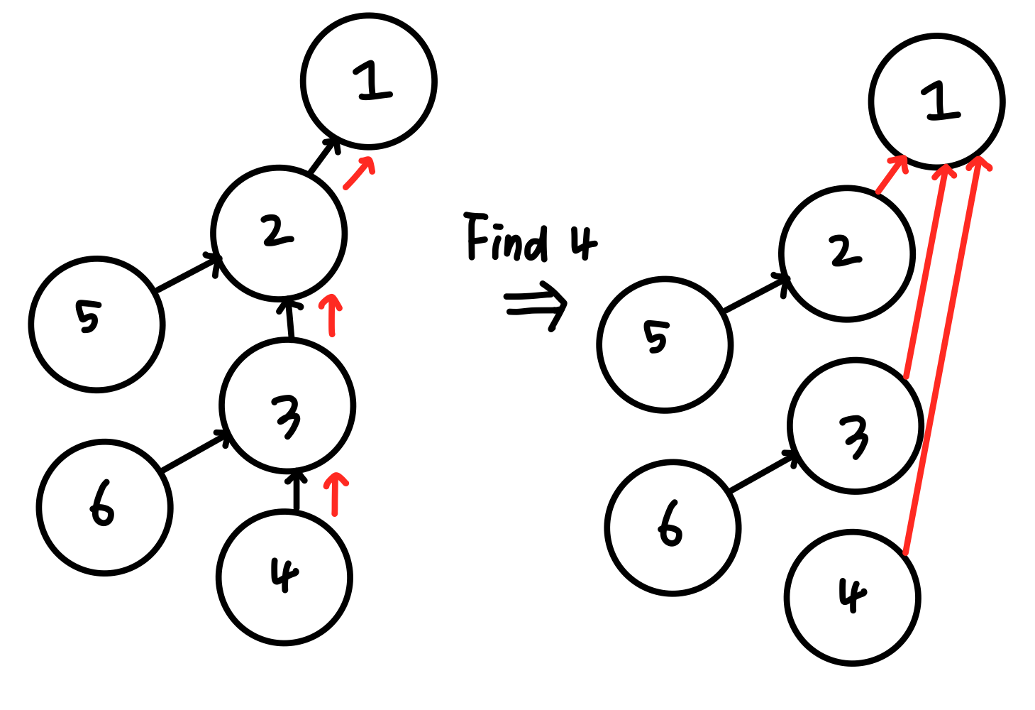이렇게 Find(4)를 하면 parent를 따라 3, 2 노드를 거쳐 루트노드인 1에 도달하는데, 루트노드 1을 찾으면 경로에 있던 2와 3노드의 parent를 1로 바꿔주는 것입니다.